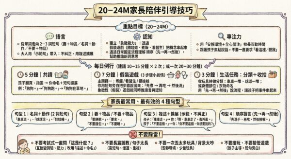 • 表達:目標先放在「10–20 個功能性詞」(吃、要、抱、車、球、狗、媽媽…)+擬聲詞也算