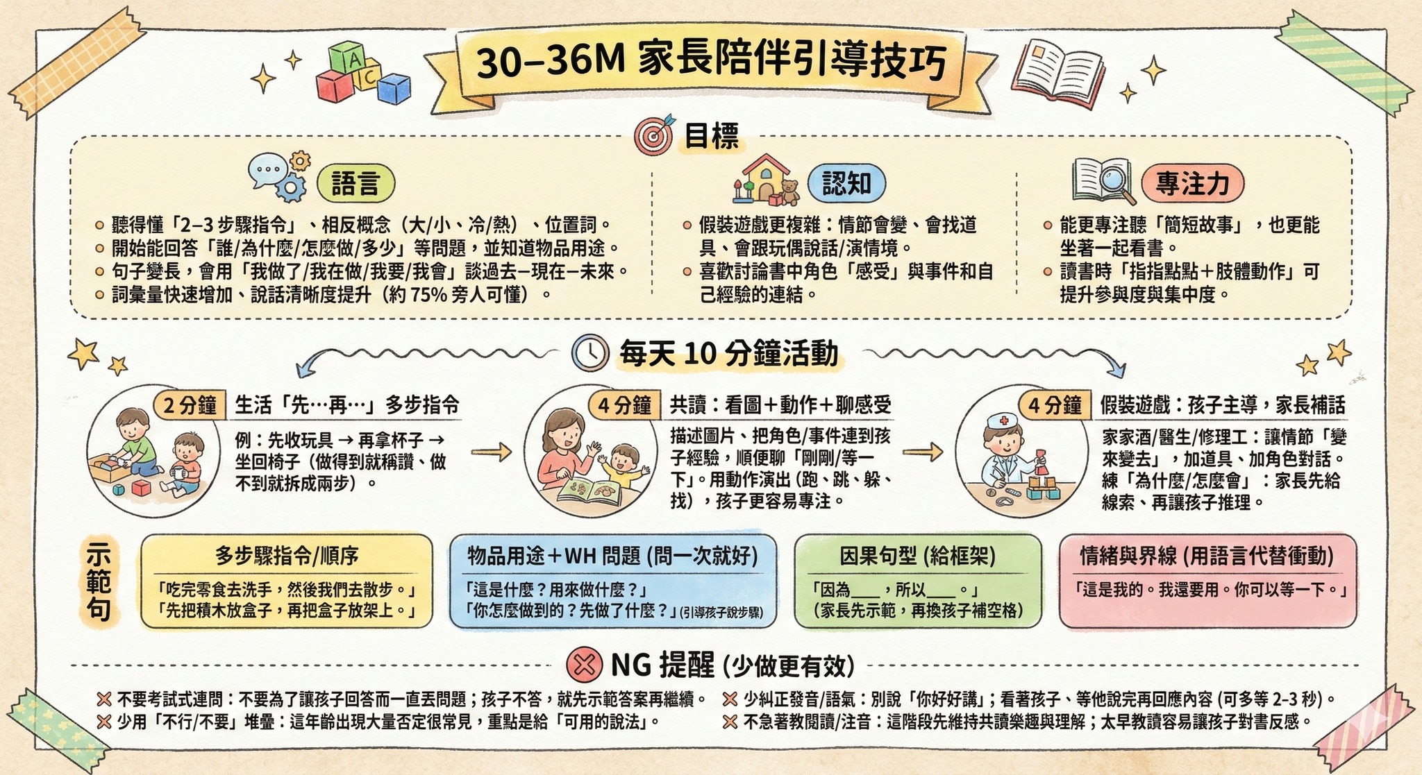 31–36月能理解並遵循多階段指令(例:吃完零食→洗手→散步)。