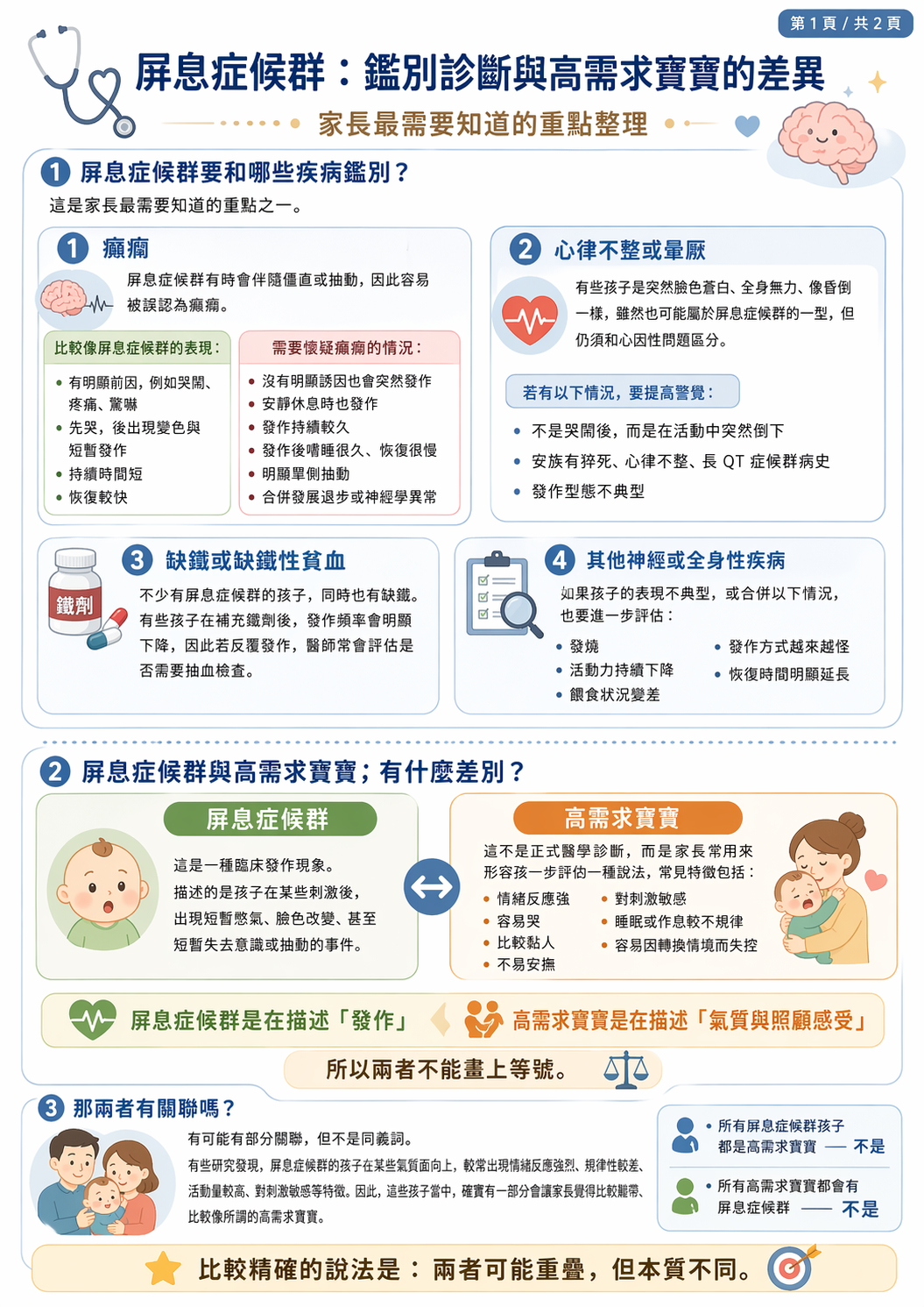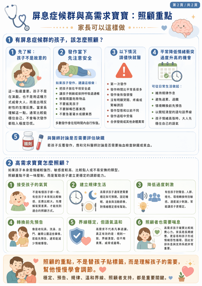 另外,屏息症候群不等於高需求寶寶。前者是臨床發作現象,後者是氣質與照顧感受的描述。兩者可能有交集,但不能混為一談。