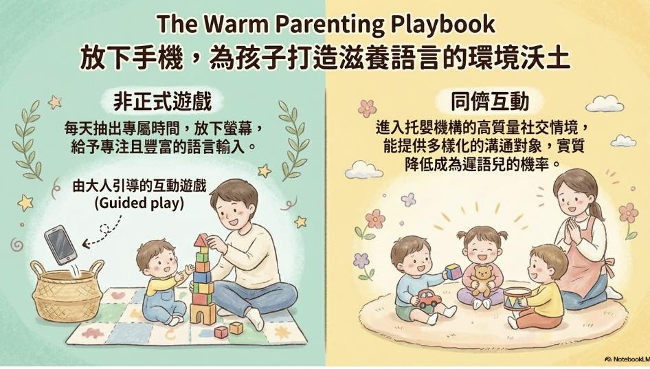 更好的方式是跟著孩子玩、描述他正在做的事、在他有一點點表達時立刻接住,再幫他多加半步。家長的角色不是監考老師,而是高品質的互動夥伴。