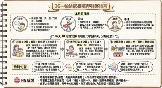 這個階段的孩子可以聽懂越來越複雜的句子,也會開始問為什麼?雖然有時可以把注意力焦點從眼前的事轉移到聽大人說的話,但基本上還是一次只能注意一件事喔!
